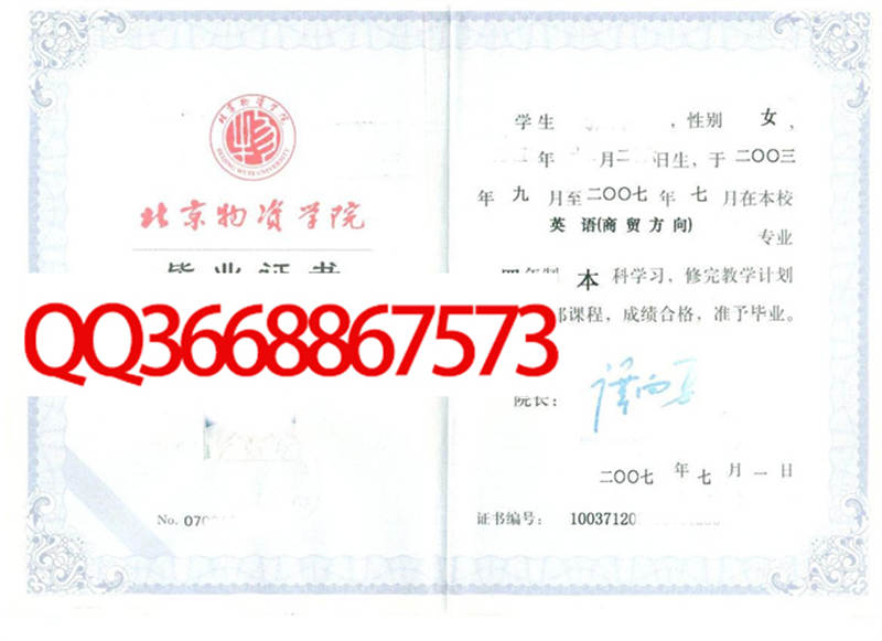 北京物资学院成绩单毕业证档案学位证样本