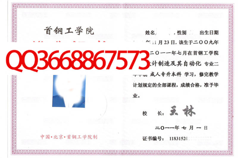 首钢工学院成绩单毕业证档案学位证样本